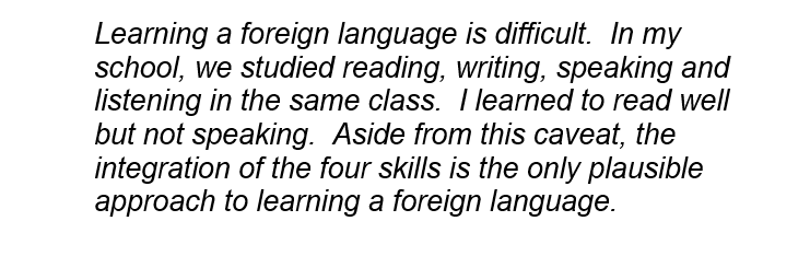 Now, I can no long claim that it’s easy to find plagiarism using the sentence, “Aside from this caveat….” If a student plugged that into AI, it could come out as, “Even with this problem, I still think that learning the four skills together is the best way to study a foreign language.”