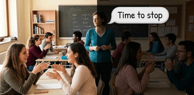 For most of this class time, students were engaged in a special conversation-skill activity. The class was almost over, so I wanted to get everyone’s attention, “We’ll need to stop in three minutes.” No one seemed to notice me. After three minutes I said that it was time to stop. But hardly anyone flinched. After another three minutes, I turned the lights on and off. Still most continued to talk. So finally, I turned the lights off. Even then in the dark, some pairs continued talking.